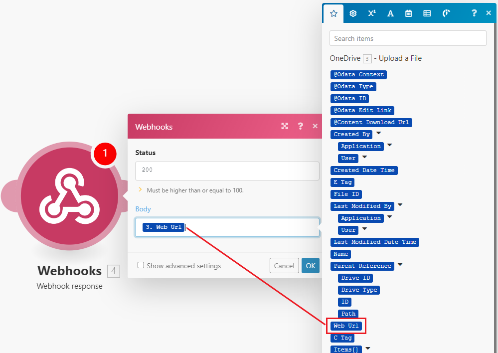 今度は、API Connectorの応答の一行目bodyで、Integromatモジュール4: Webhooks responseで設定したOneDriveのアップロード先URLが確認できるはずです。