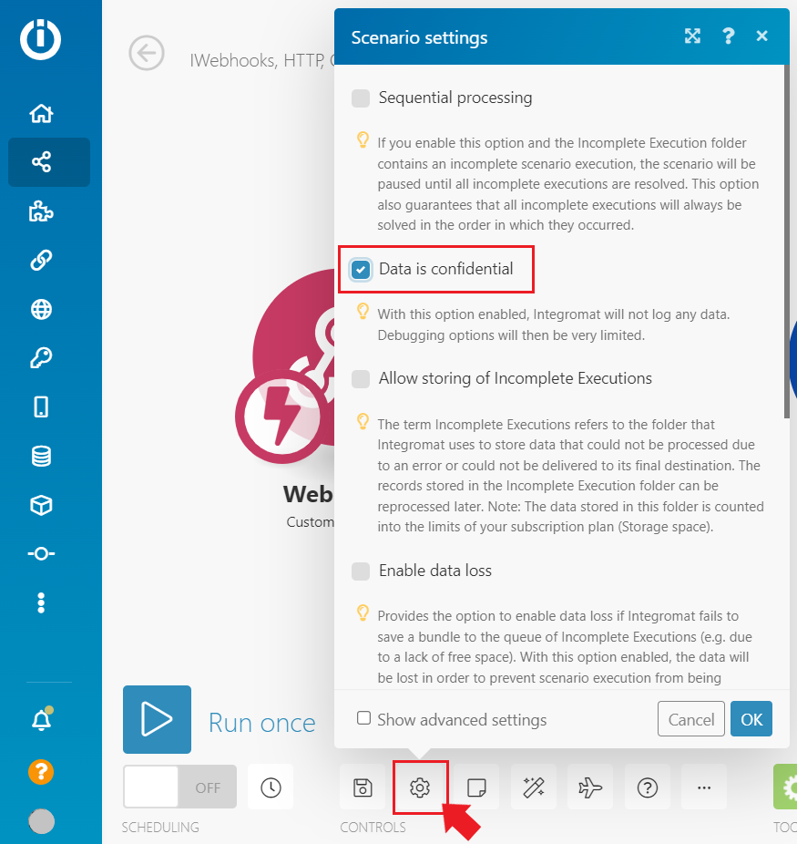Integromatではシナリオ単位でデータの機密保持に関する設定ができるので、ファイル等データのやり取りが発生する場合はこちらを設定するのがおすすめです。